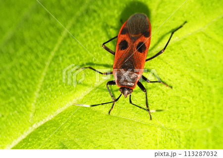 生き物 昆虫 ヒメマダラナガカメムシ、赤色に黒い模様。模様の変異は大きく前翅がほぼ黒いタイプも