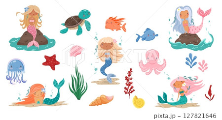 Cute mermaids. Fairytale underwater princess, mythological sea creatures, dolphins, treasure chest. Magic kids world vector game characters