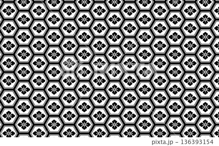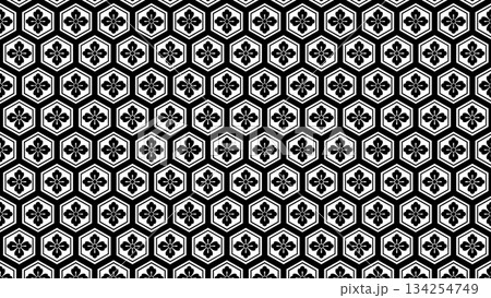 シームレスなモノクロ和柄パターン。亀甲花菱模様。