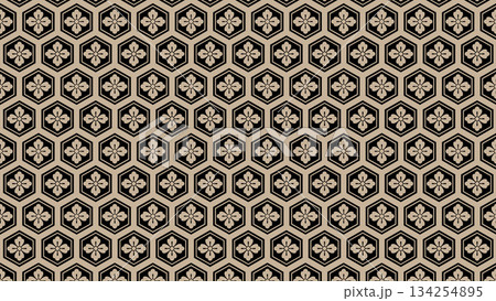 シームレスなゴールド和柄パターン。亀甲花菱模様。