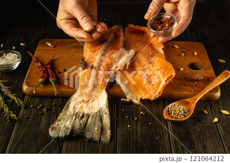 Hands are carefully sprinkling spices over a freshly sliced fish fillet on a wooden cutting board. Dried chilies, herbs, and spices surround the fish, creating an inviting culinary atmosphere