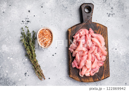 Raw sliced Chicken meat, strips fillets on wooden board. grey background. top view
