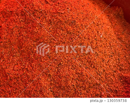 Close-up of bright red spice mixture with seeds and herbs. Culinary ingredients, flavor diversity and gastronomy.