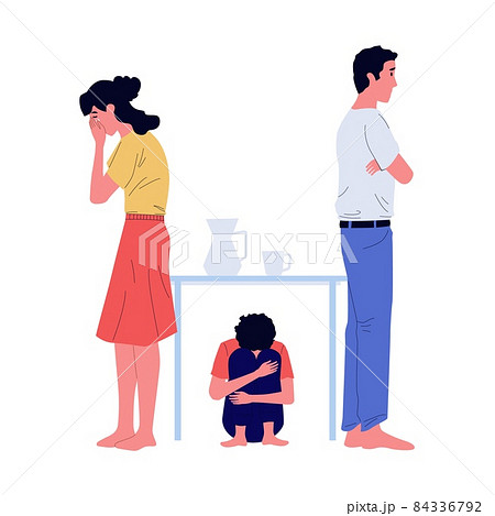 Mother and father quarreled. Offended kid under table. Family conflict. Unhappy persons disregard each other. People argue with boy. Disagreement or divorce. Vector crisis relationship