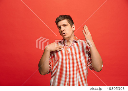 Beautiful male half-length portrait isolated on red studio backgroud. The young emotional surprised