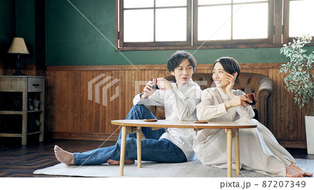 くつろぐアジア人の若いカップルまたは夫婦のイラスト素材