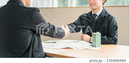 ビル,テナントの契約,商談をする作業着姿の若いアジア人ビジネスマン