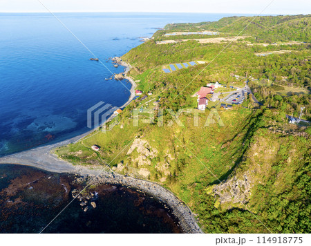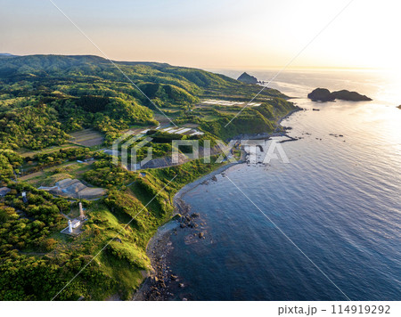 弾埼灯台と二ツ亀、大野亀(新潟県佐渡市 ※二ツ亀、大野亀は奥)
