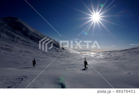 冬の知床半島・二ツ池野営指定地を歩く登山者