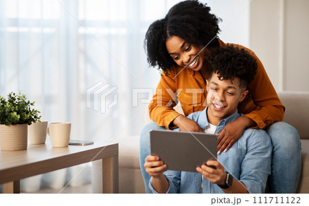 Happy young african american man and lady, hugs, use tablet, watch video on device