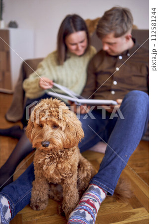 young couple looking at their wedding photo album by the bed in living room, cockapoo running around
