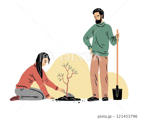 Man woman walking side side, holding hands. Both casually dressed, man jacket woman coat. Illustration couple enjoying leisurely walk, surrounded plants