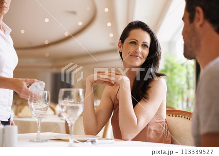 Couple, restaurant and date for lunch, service and love for celebration on holiday. Woman, man and fine dining with luxury, smile and romance for vacation or marriage anniversary with gourmet meal