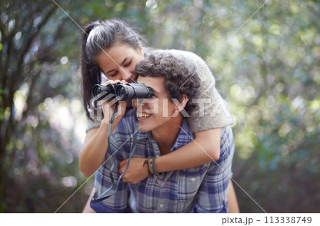 Man, woman and piggyback in forest with binocular for travel, adventure or sightseeing in nature with happiness. Couple, people and tourist hiking outdoor in woods for experience, holiday or vacation