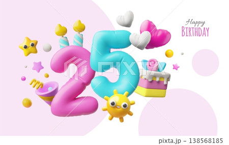 3D inflatable number 25 with cake, candles, sun, star, hearts, birthday banner.