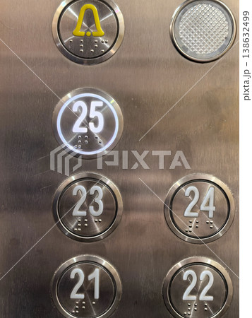 Close-up of an elevator control panel with the 25th floor button illuminated.