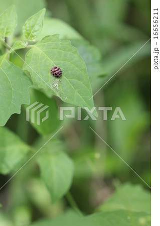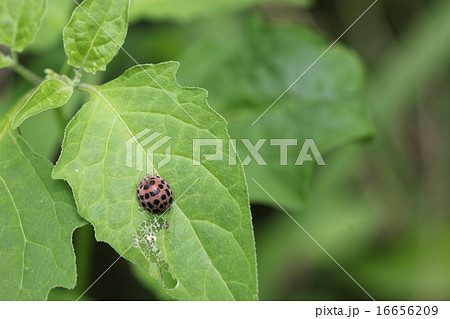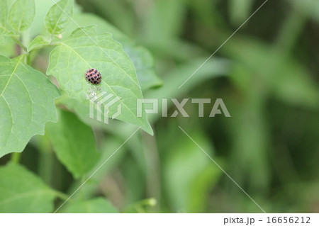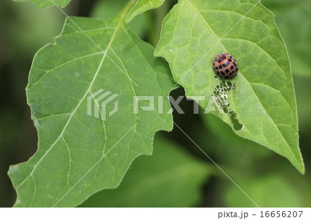 ジャガイモの葉の上にニジュウヤホシテントウ