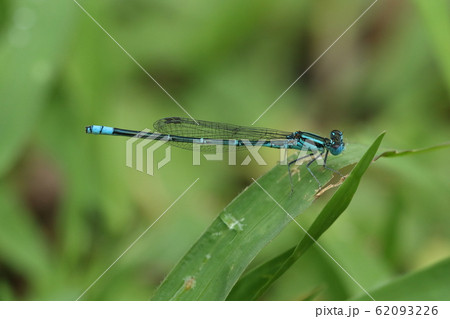生き物 昆虫 ムスジイトトンボ、鮮やかなブルーが美しいオス。水辺の草の葉で縄張りを主張?
