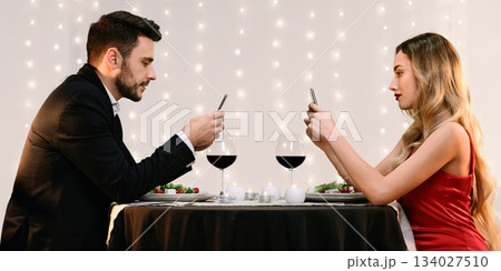 Social Media Addiction Concept. Couple spending time with their smartphones on romantic date in restaurant, ignoring each other