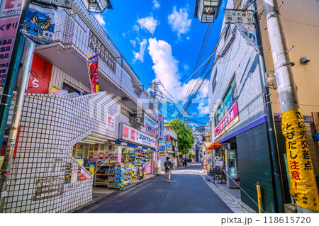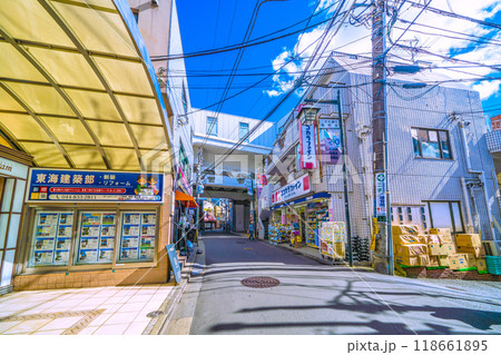 日本の川崎都市景観 二子新地駅東口への細い通路や周辺の街並み(二子橋、サイン「神奈川県川崎市」)