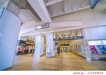 日本の川崎都市景観 6月。高架下の二子新地駅東口。駅前の商店街・二子大通り商和会などを望む