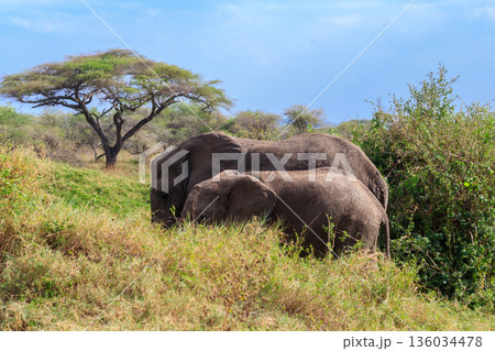 Pair of african elephants in savanna in Serengeti National park in Tanzania