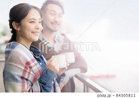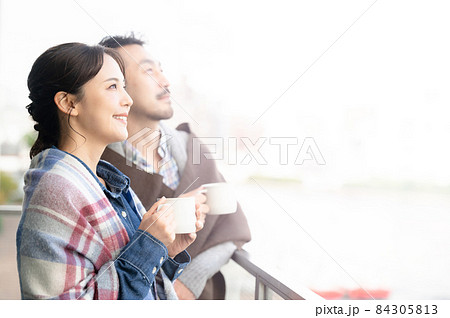 ベランダからコーヒーをもって外を見つめる日本人のカップル 横向き