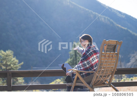 田舎のウッドデッキでリモートワークをする女性の秋冬 カメラ目線の広角の顔無し