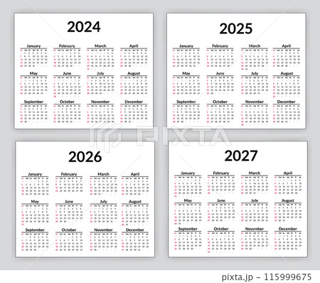 2024, 2025, 2026 and 2027 calendar set. Week starts on Sunday. Simple calendar layout. Yearly diary. Minimal stationery template with 12 months, in English. Pocket or wall formats