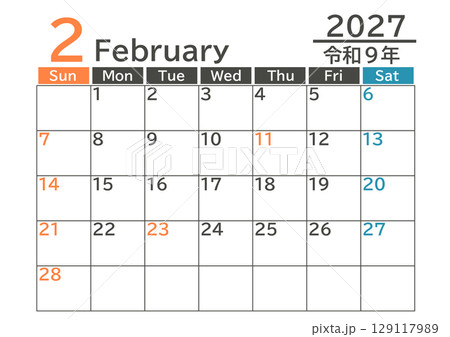 日本の祝日色付日曜始まり2027年2月のマンスリーカレンダー素材