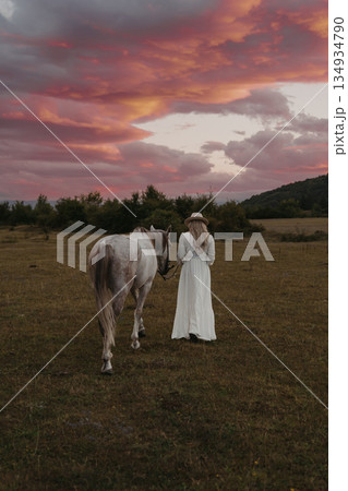 Woman walks a horse under a colorful sky at sunset in a field