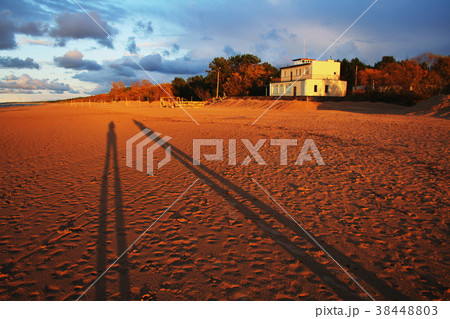 Two long shadows of people on beach during sunset