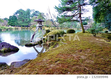 兼六園 霞が池の徽軫灯籠(ことじとうろう)が遠くに見える風景 石川県金沢市