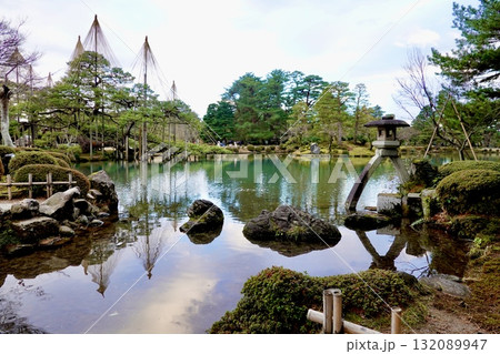 兼六園 雪吊りされた唐崎松の枝の下で数羽のホシハグロが霞が池に浮かんでいる風景 石川県金沢市