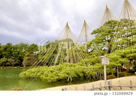 兼六園 霞が池の上に伸び出た唐崎松に雪吊りが施されている風景 石川県金沢市