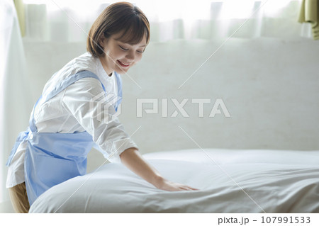 ベッドメイクをする可愛い女性