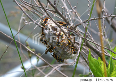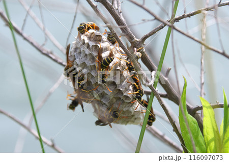 生き物 昆虫 フタモンアシナガバチ、五月。河原にある柵の下の巣で女王蜂が子育て中かな?