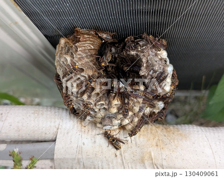 エアコンの室外機にできたフタモンアシナガバチの巣