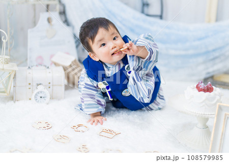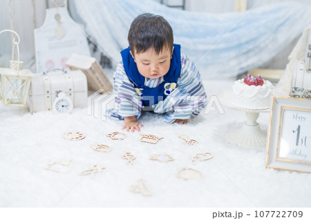 バースデーフォトセットで1歳の誕生日をお祝いして選び取りをする和服姿の可愛い赤ちゃん
