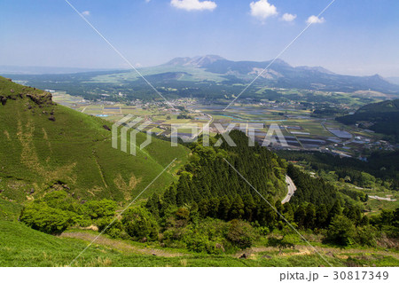 阿蘇五岳を背景に阿蘇市街地パノラマ絶景風景「 豊後街道・二重峠石畳の道(新緑)」阿蘇市