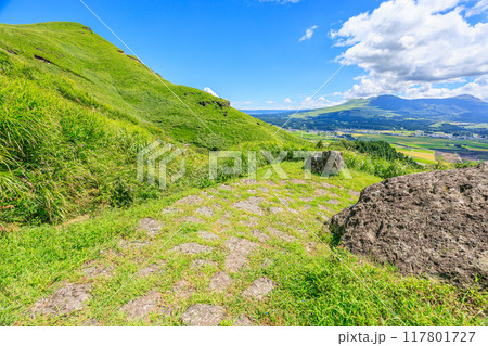 阿蘇五岳を背景に阿蘇市街地パノラマ絶景風景「 豊後街道・二重峠石畳の道(新緑)」阿蘇市