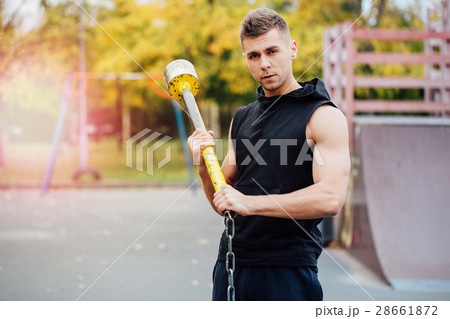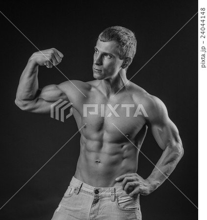 Active lifestyle concept. Professional bodybuilder showing perfect muscular body, lamps illumination on background
