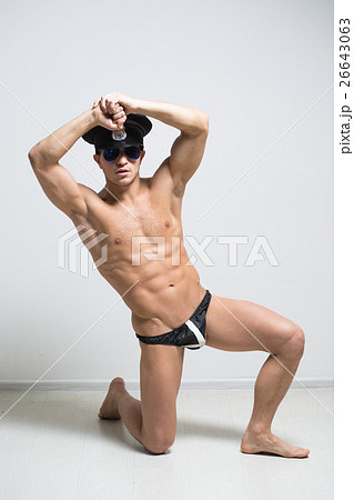 Young handsome shirtless guy showing nude torso sexy on bed at h