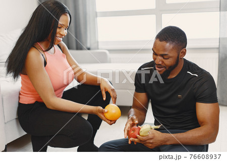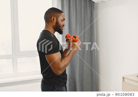 Man in a isolations. Guy training in a room. Man with dumbbells.