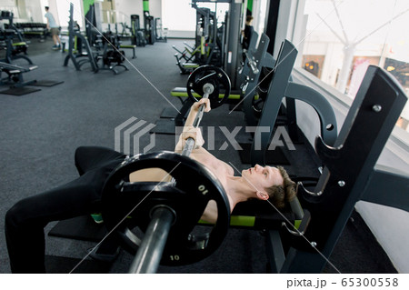 Man with barbell during bench press exercise in gym. Mature Man In Gym Exercising On The Bench Press