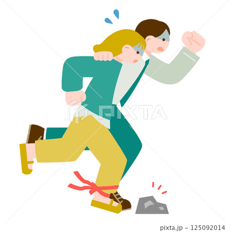 二人三脚でゴールする男女のイラスト 協力・達成の夫婦のイメージ