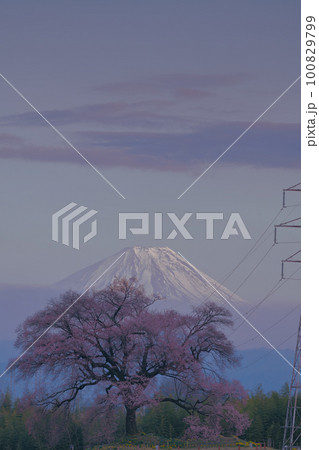 韮崎市神山町、咲き始めたわに塚の桜と夕景富士