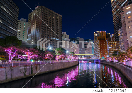 目黒川を彩る桜のイルミネーションとビル群の夜景