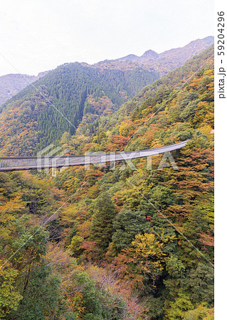 樅木の吊橋「秋晴れ、秘境の山並み紅葉風景を背景に、あやとり橋風景」日本2020年(秋)撮影