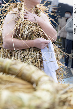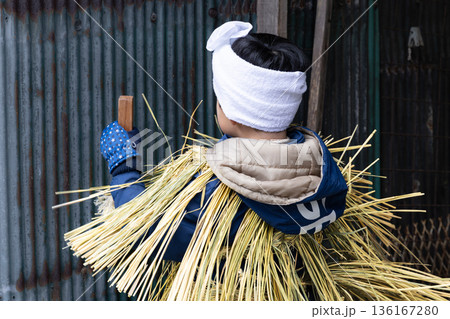 米川の水かぶりわら装束をする五日町男子